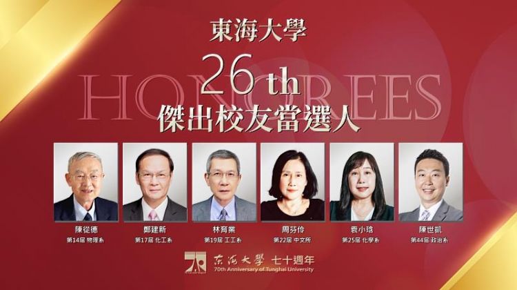 第26屆傑出校友--物理系陳從德學長、化工系鄭建新學長、工業工程系林育業學長、中文所周芬伶學姊、化學系袁小琀學姊,以及政治系陳世凱學長。分別在科學、醫藥、半導體、文學與公共服務等不同領域卓然有成,卻有著共同的特質——以專業與熱情投入社會,展現東海人不畏挑戰、勇於奉獻的精神。